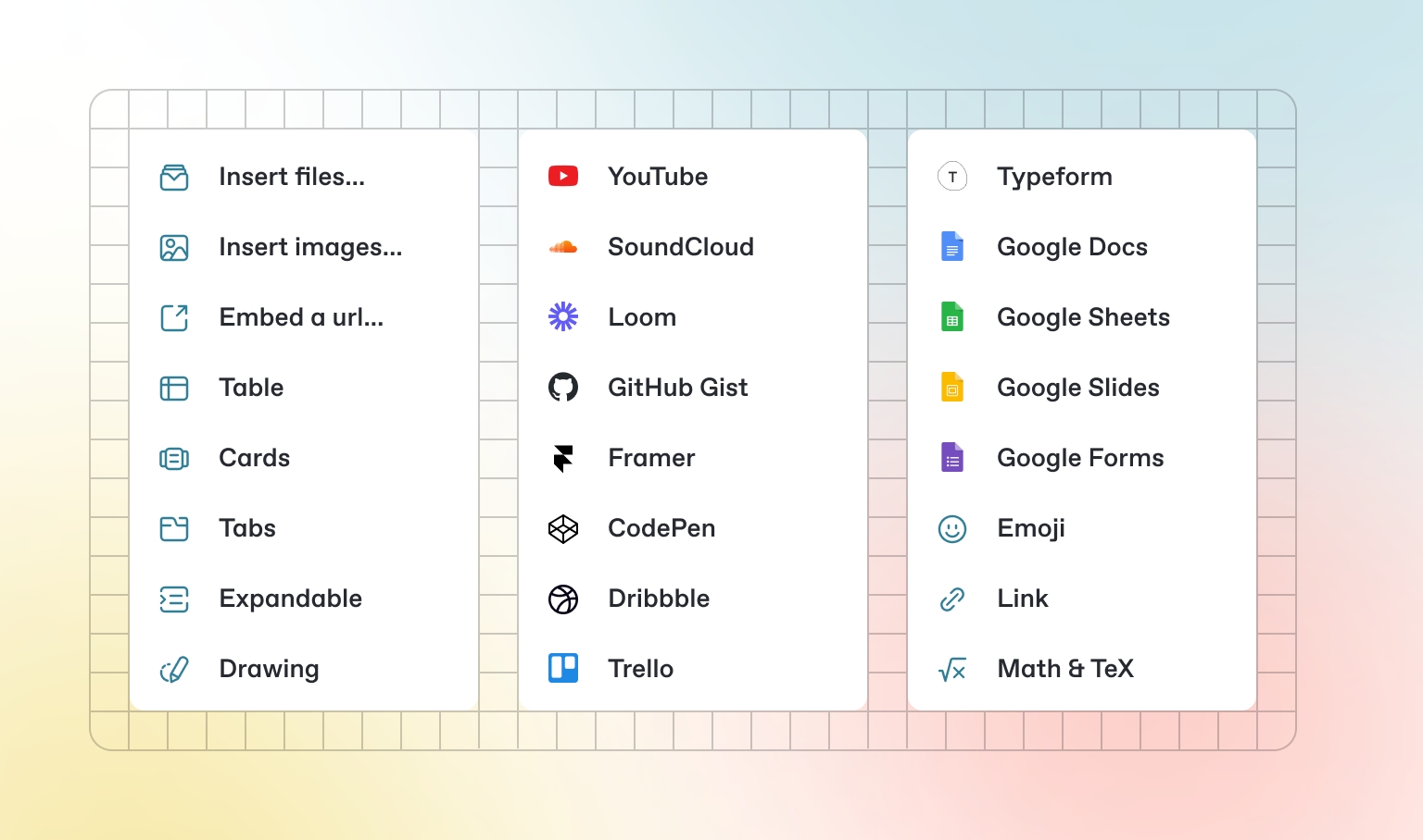 Add images, embedded content, code blocks, and more.